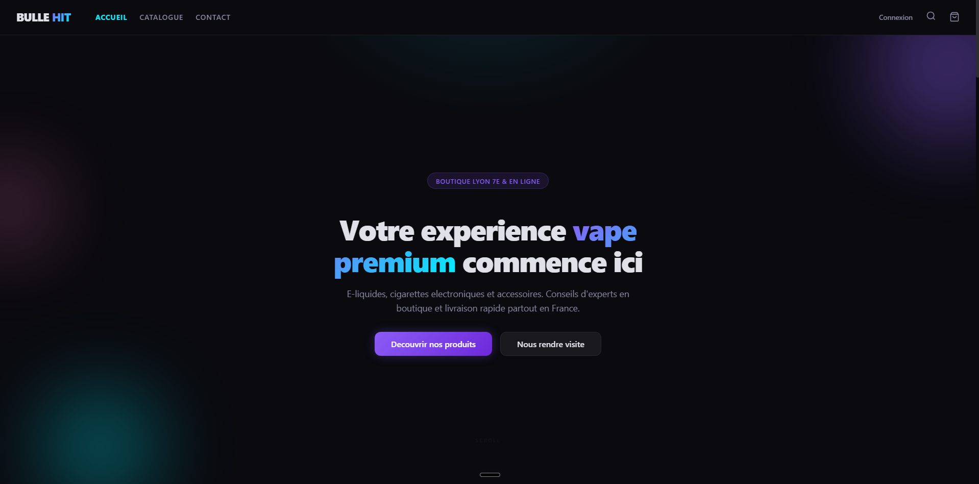 Boutique en ligne premium pour produits de vape. Design immersif avec un univers visuel sombre et colore, catalogue produit avec filtres avances, et integration boutique physique Lyon 7e. Experience utilisateur soignee du browsing au checkout.