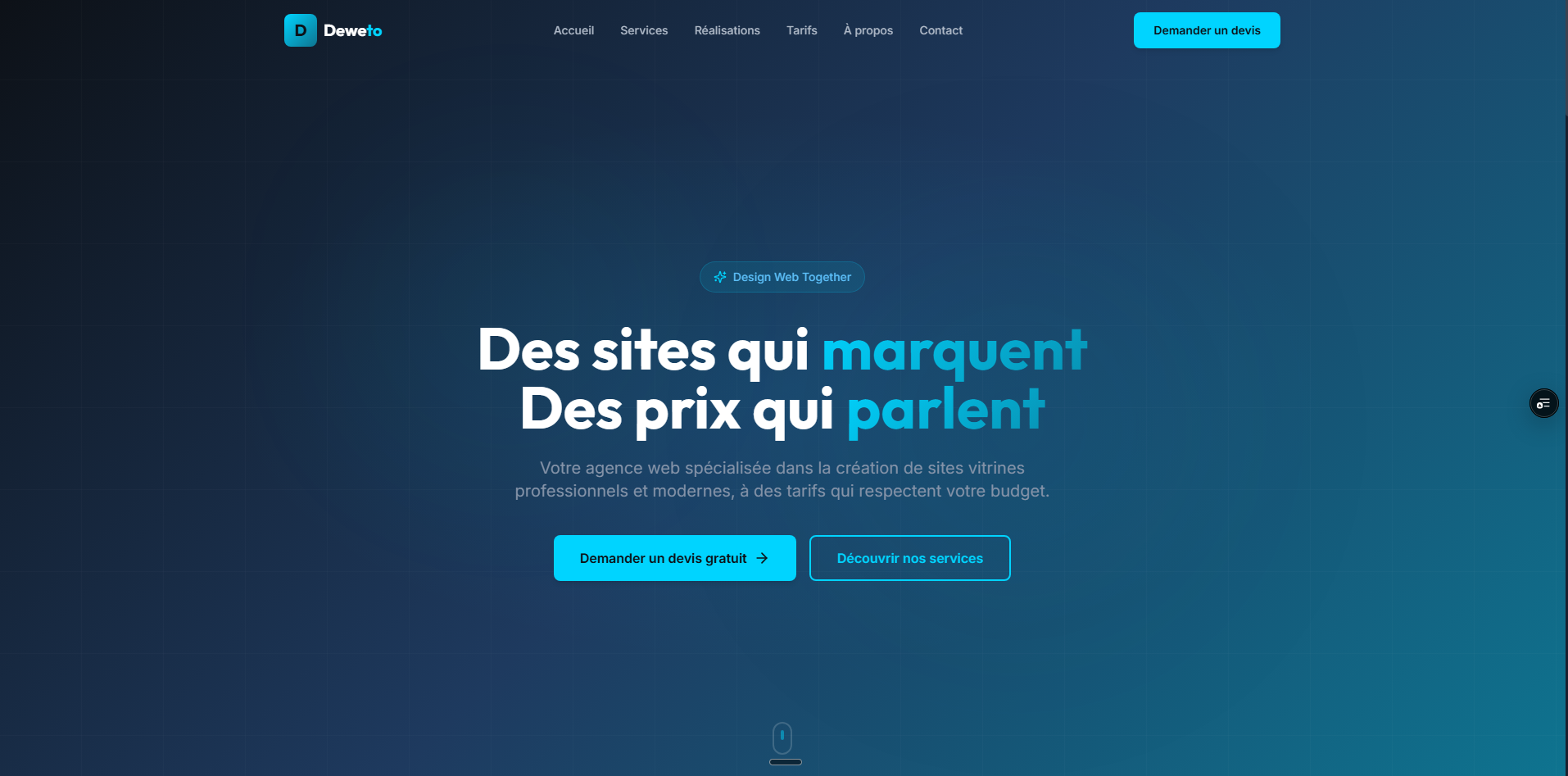 Site vitrine pour mon agence web personnelle. Design moderne et epure avec des animations fluides, presentation des services, portfolio de realisations et formulaire de contact. Optimise pour la conversion et le referencement.